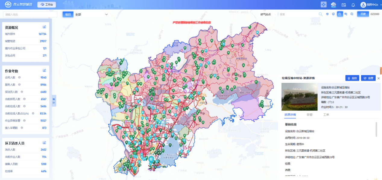 白云智慧城管平台“一图统管”16.8万余个城市部件、2.9万余个城管物资。